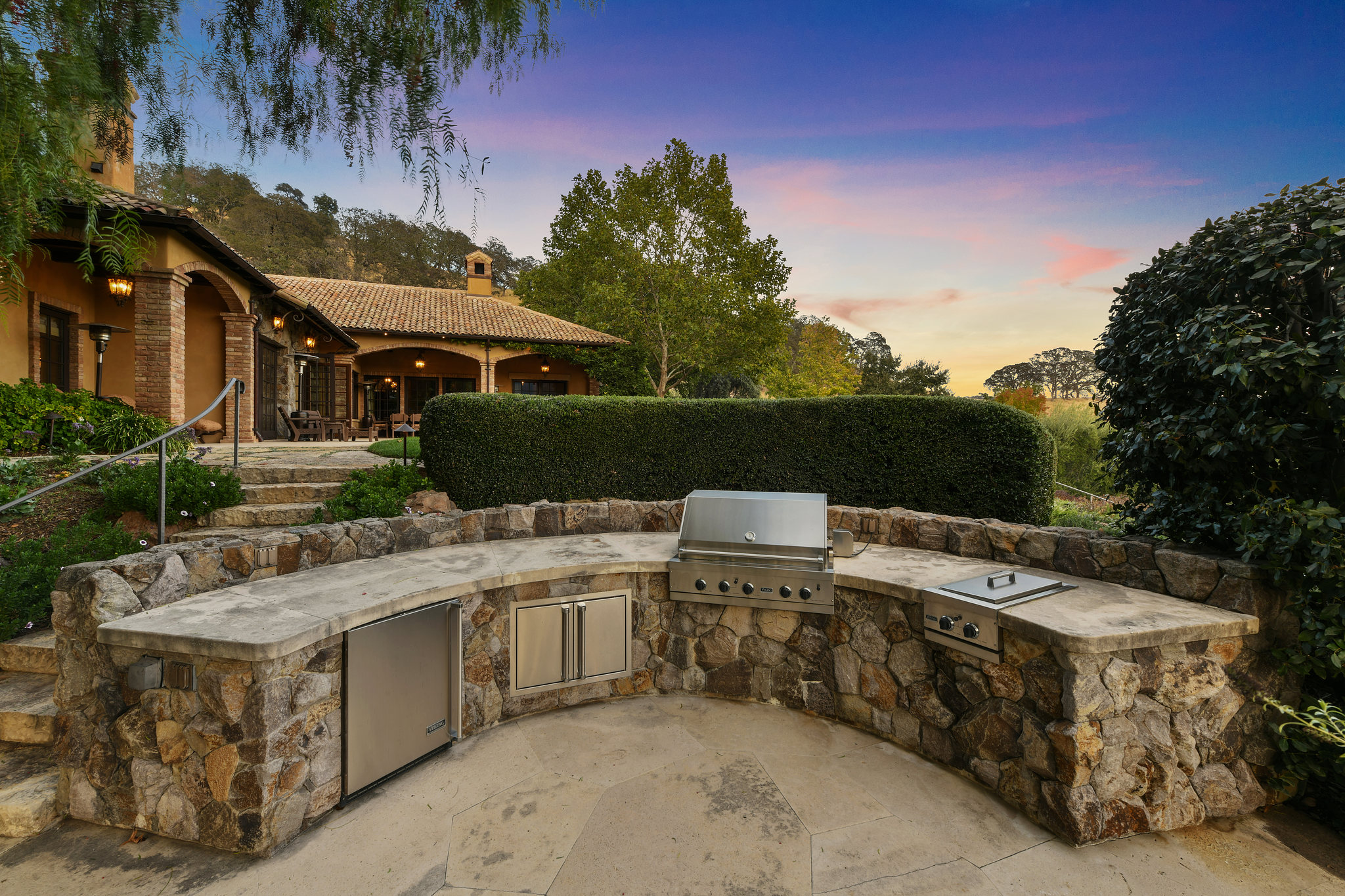 Step down from the lawn to the bocce court and outdoor barbecue center with including barbecue, gas burner, refrigerator, and expansive all-stone curved countertop