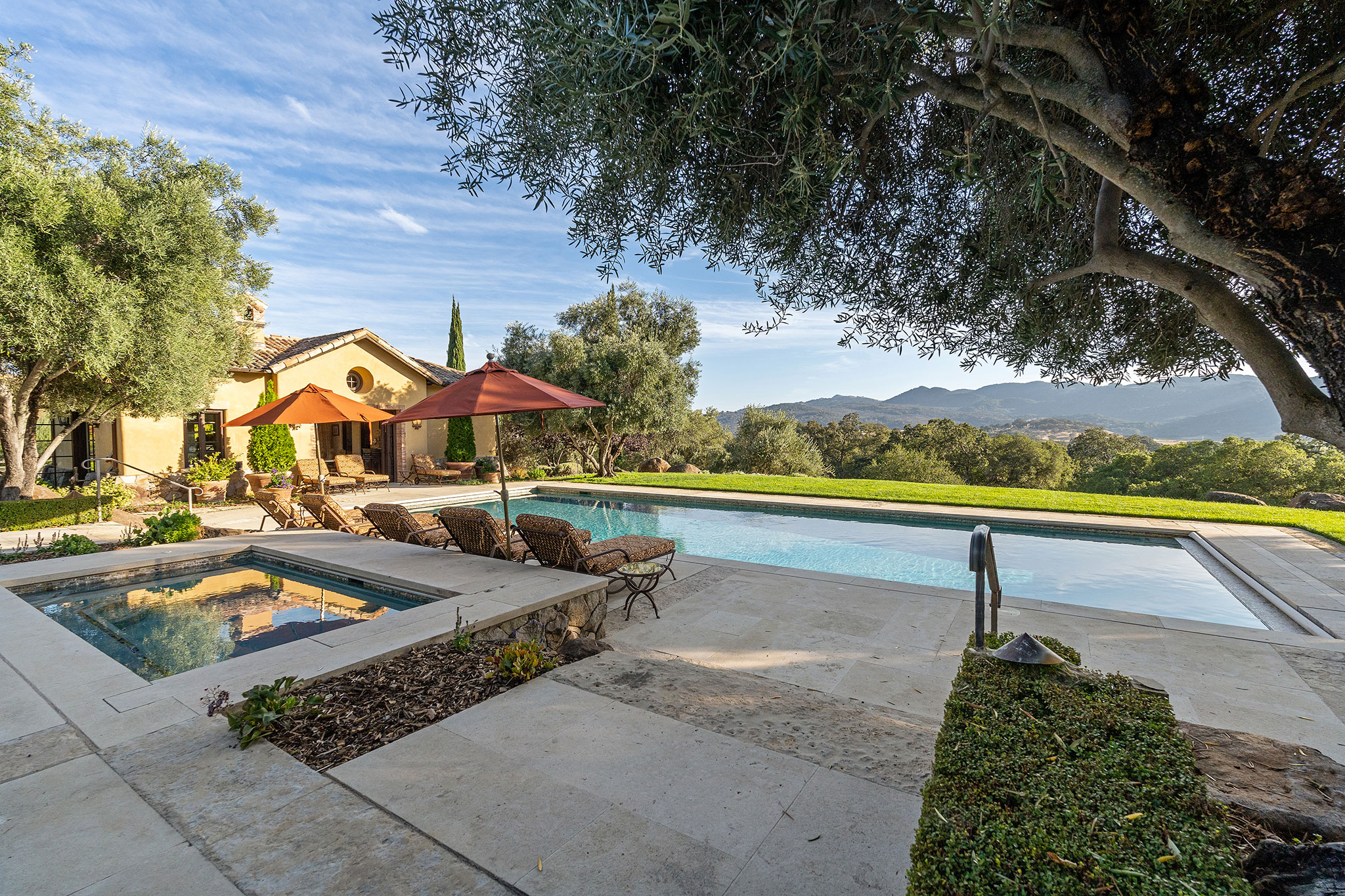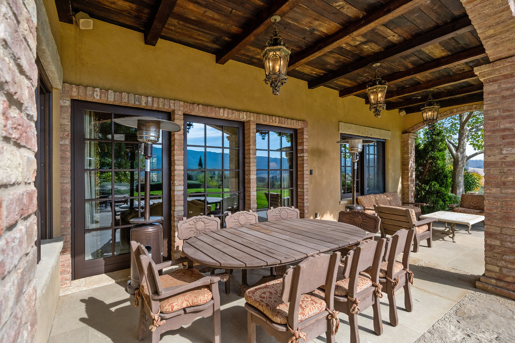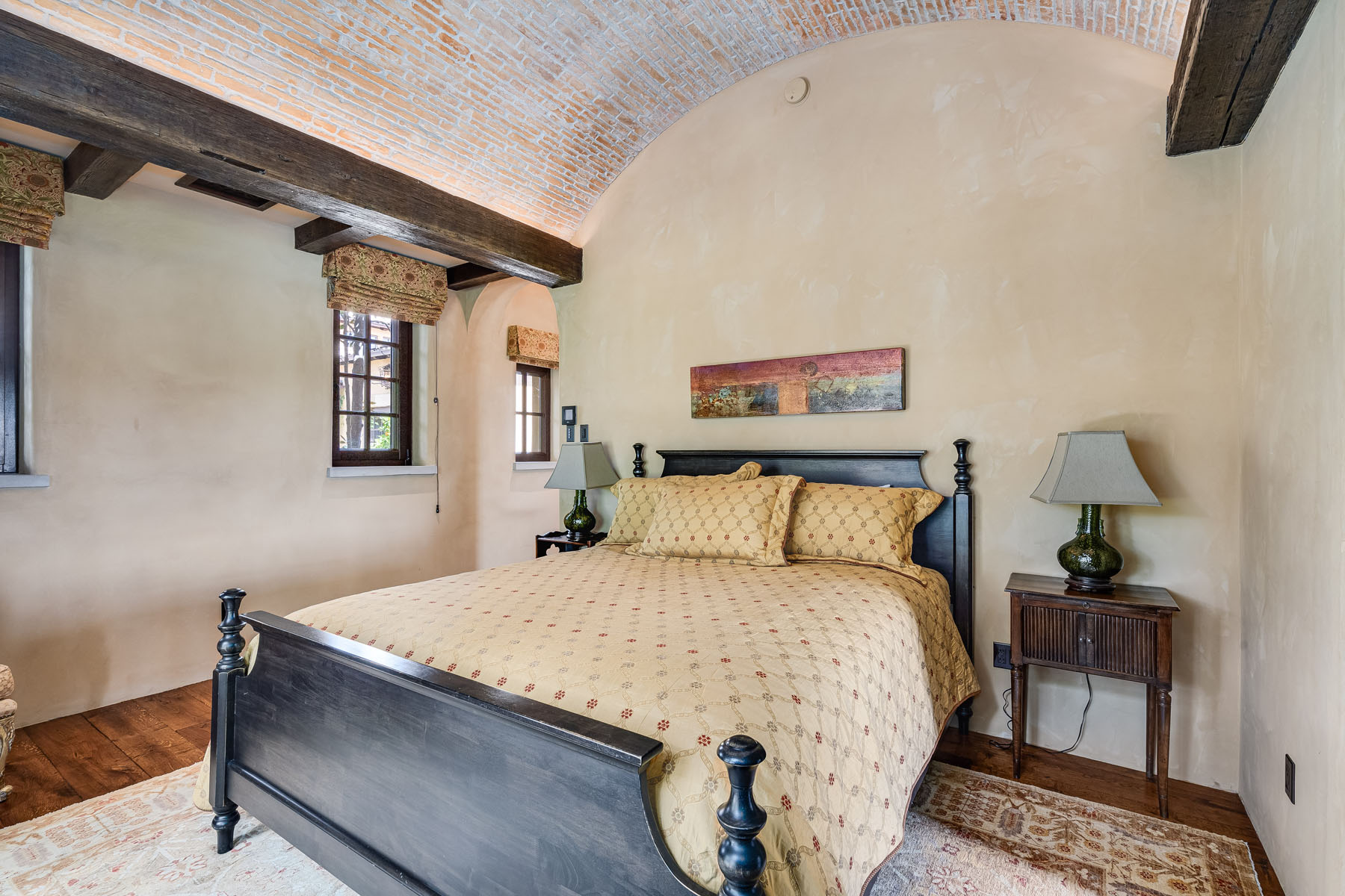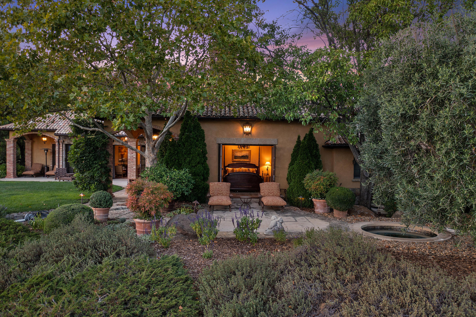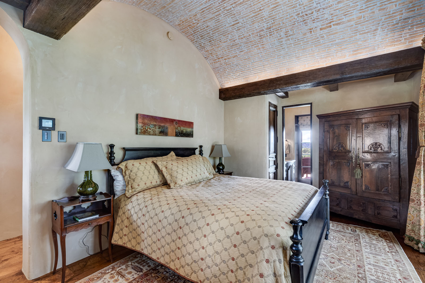 Junior primary suite has a hand painted, barrel-vaulted ceiling, French doors to a private vineyard view patio, and natural stone en suite bath with frameless-glass shower and French door to a second patio