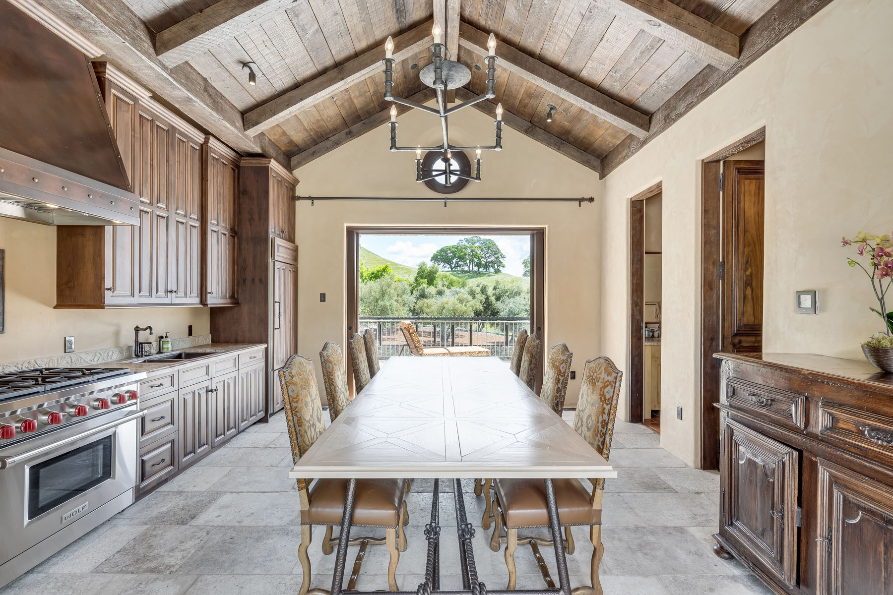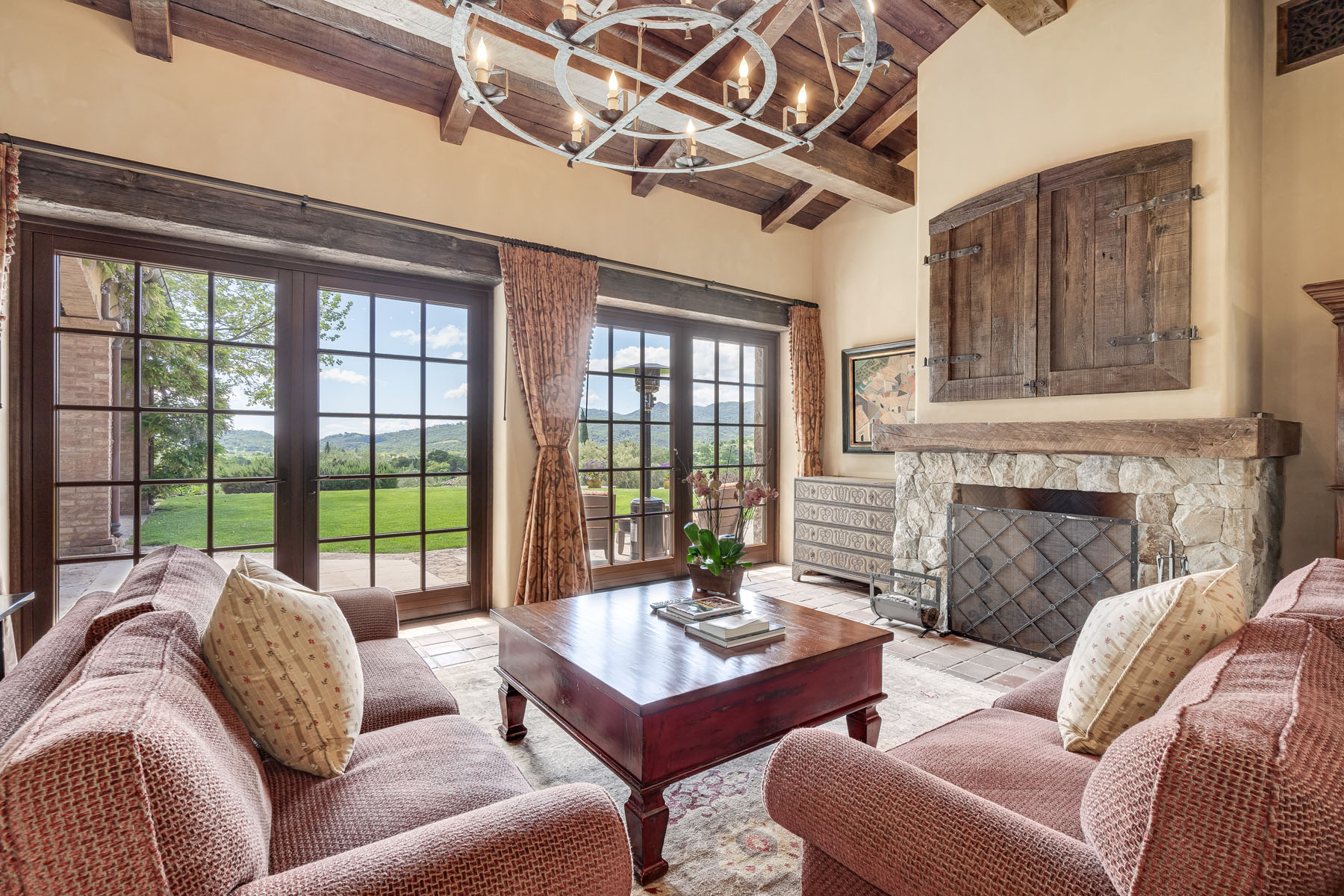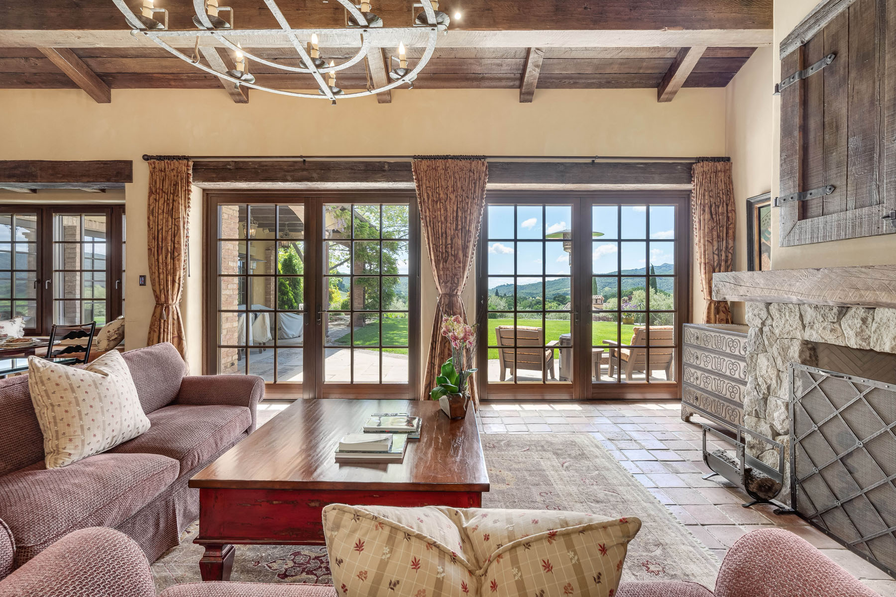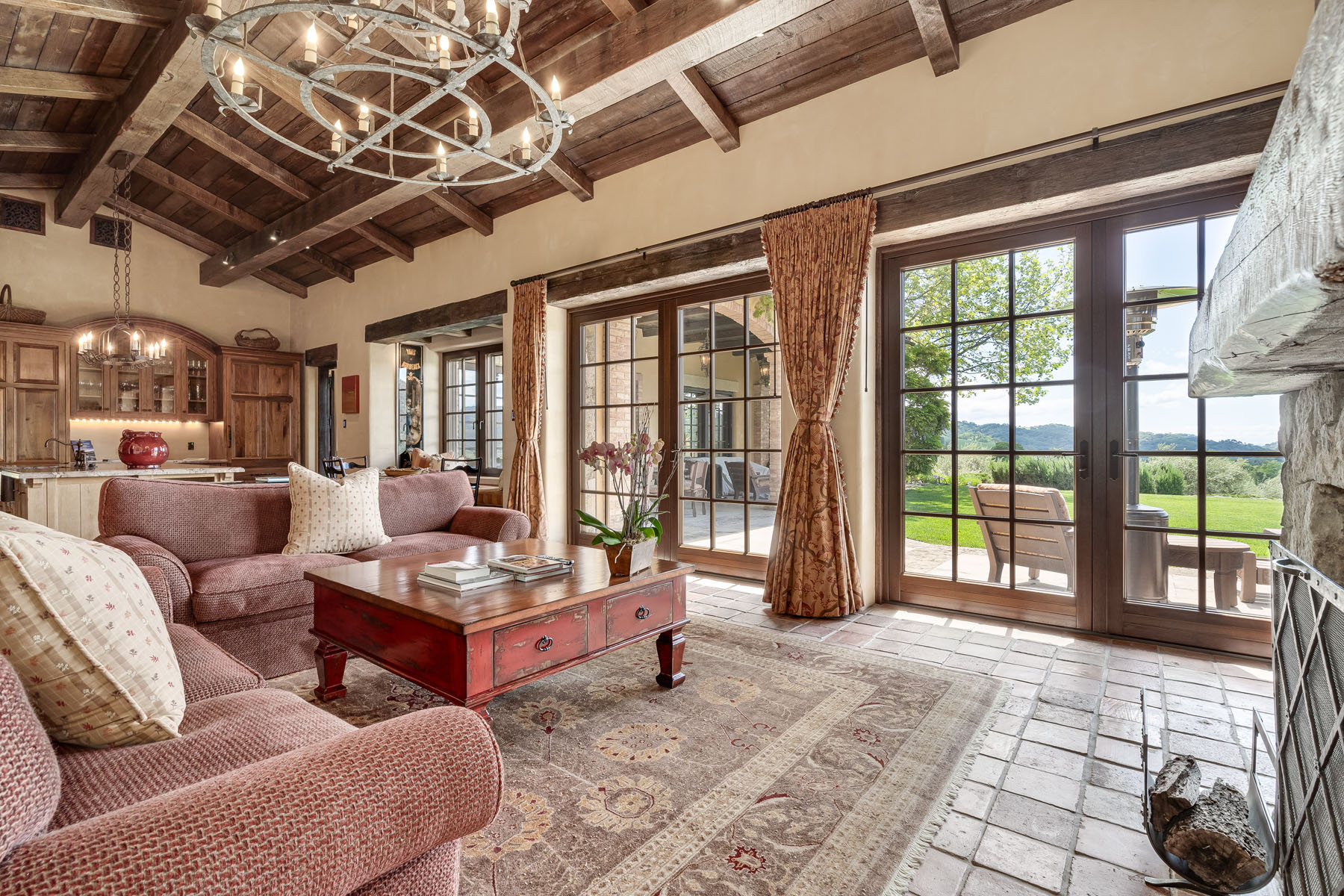 Family room, fully open to the kitchen and sharing the beamed and paneled cathedral ceiling, has a tiered Paul Ferante iron chandelier, fireplace outlined in stone beneath concealed media, and multiple French doors to the loggia