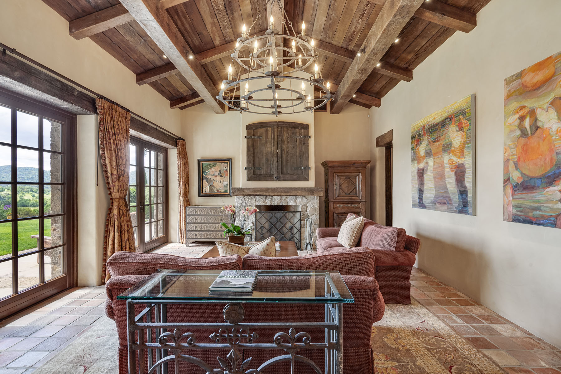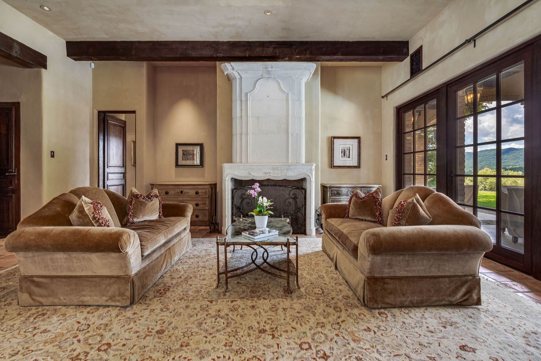 Formal living room with fireplace and towering carved stone mantelpiece from France; French door and matching windows open to the loggia and views