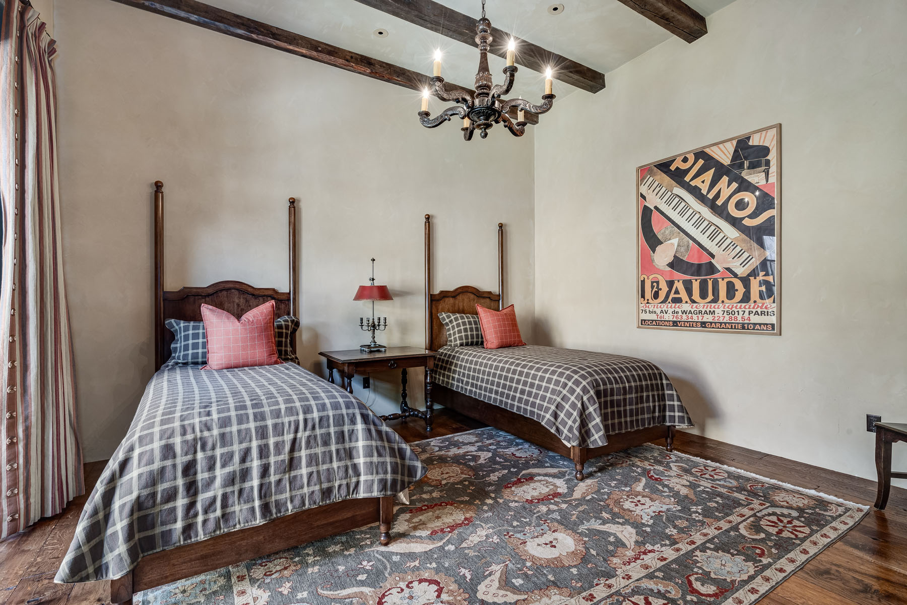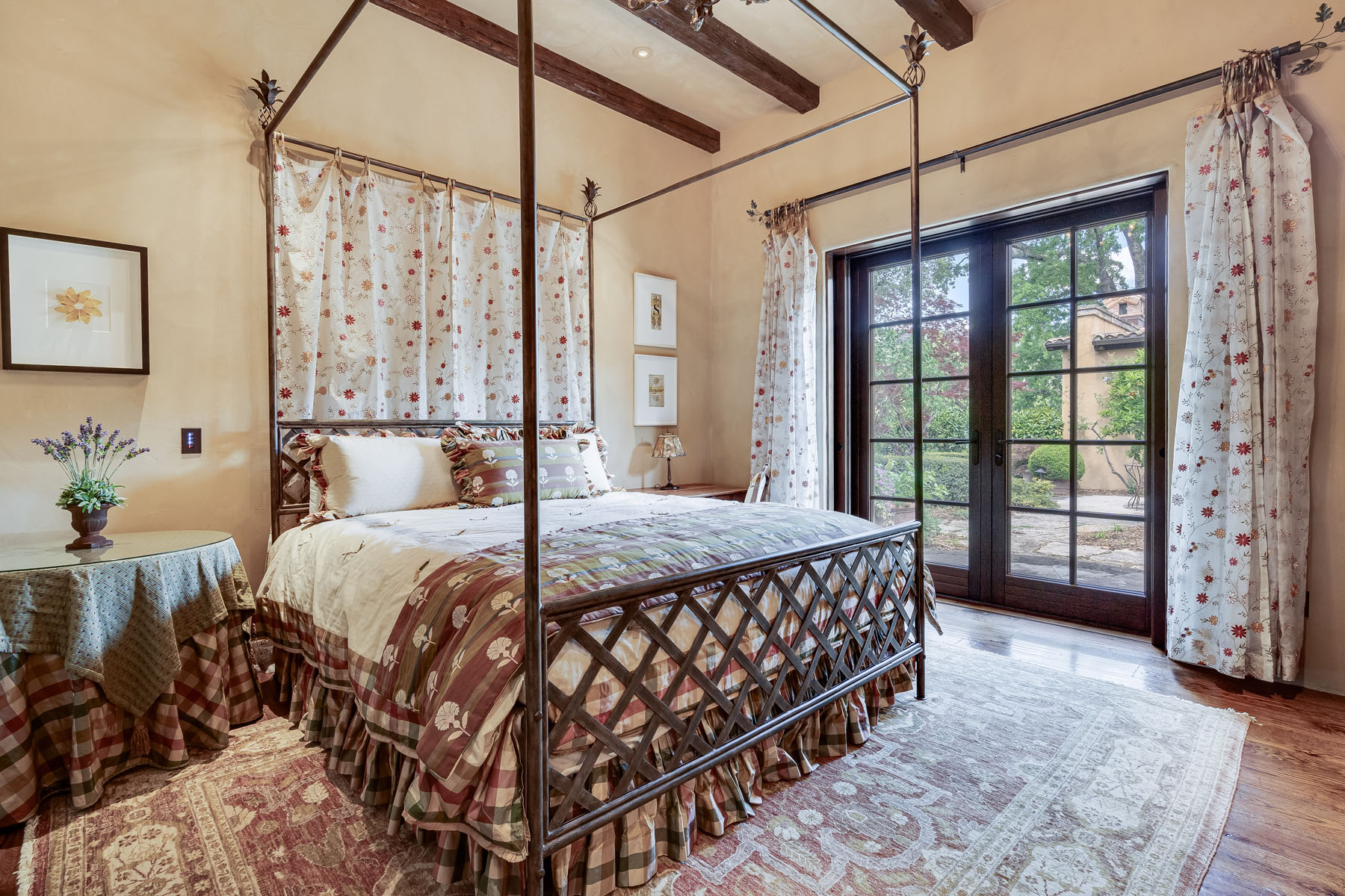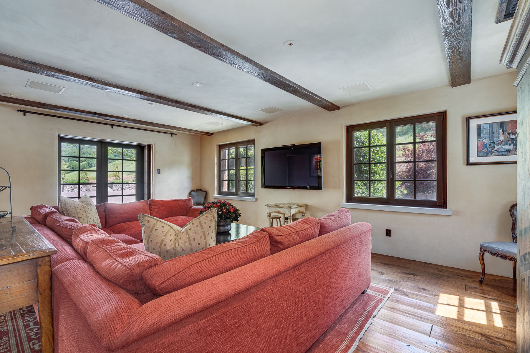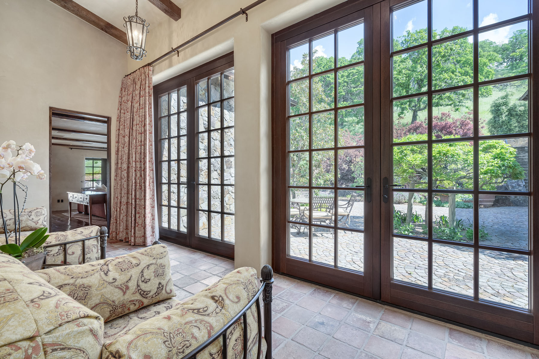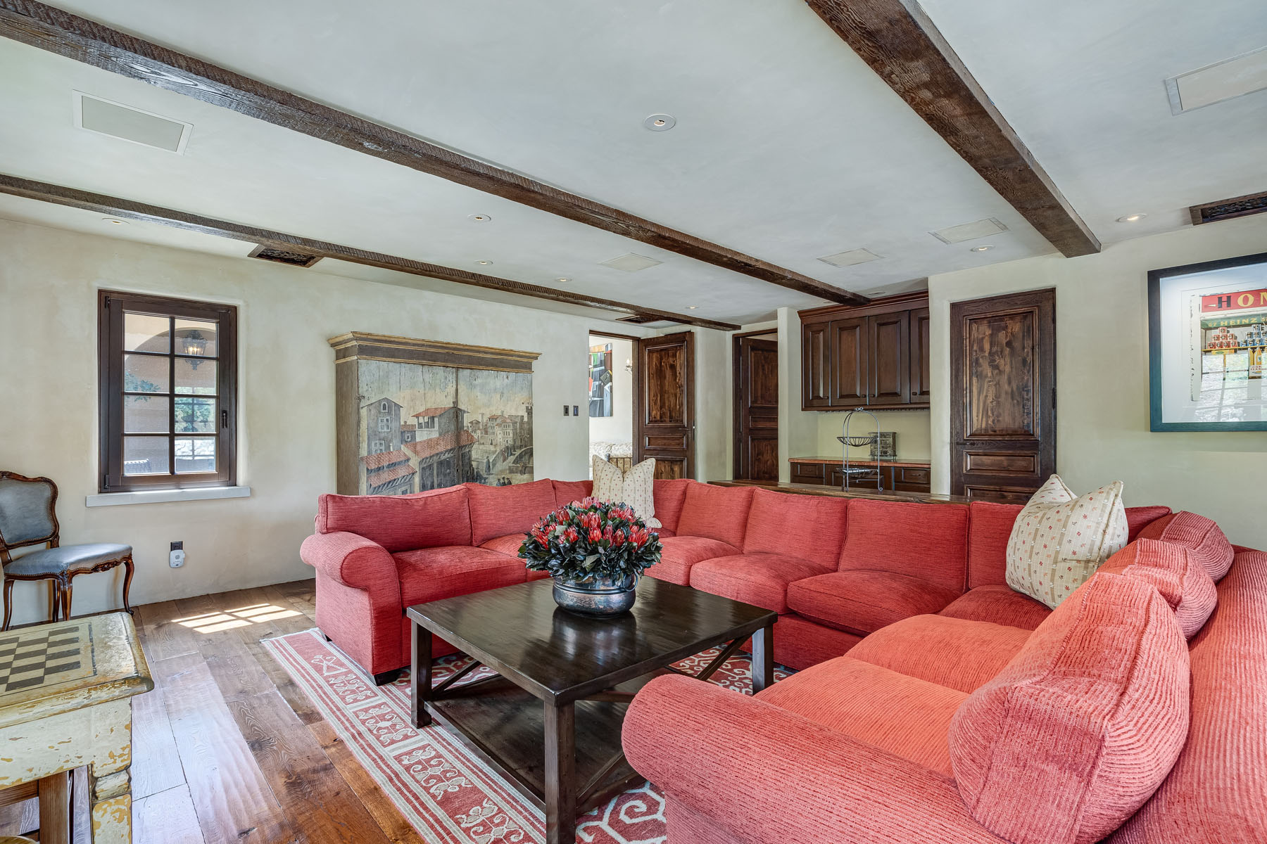 Double doors beneath a fan light open to the foyer; subtly hued plaster walls, hand-hewn ceiling beams, and stone paver or hardwood floors continue into most rooms