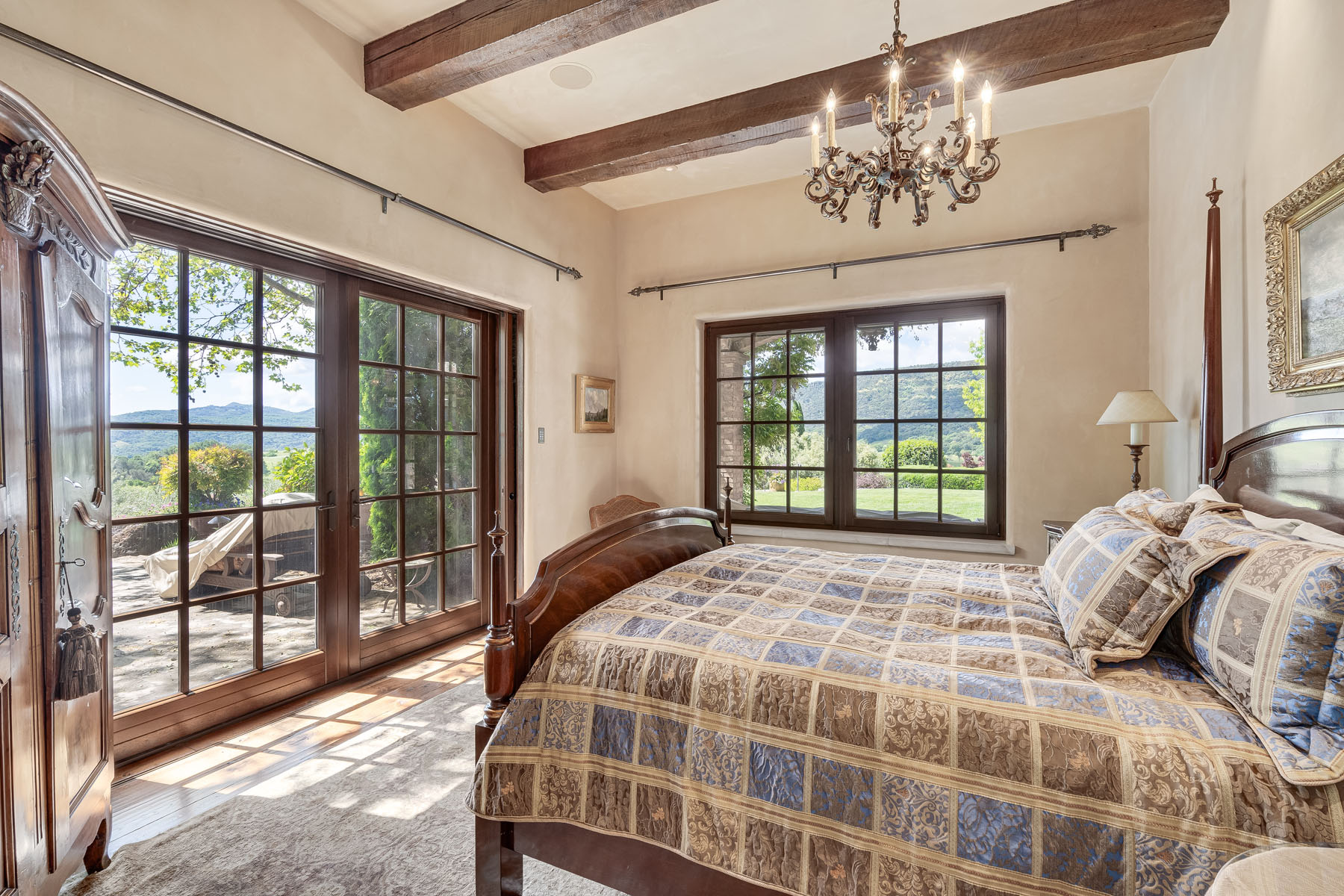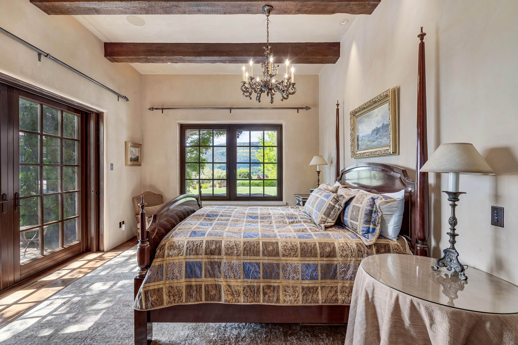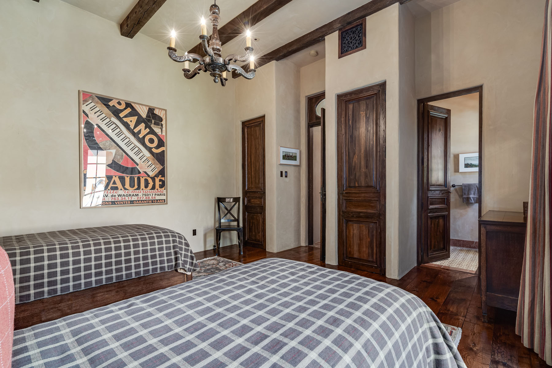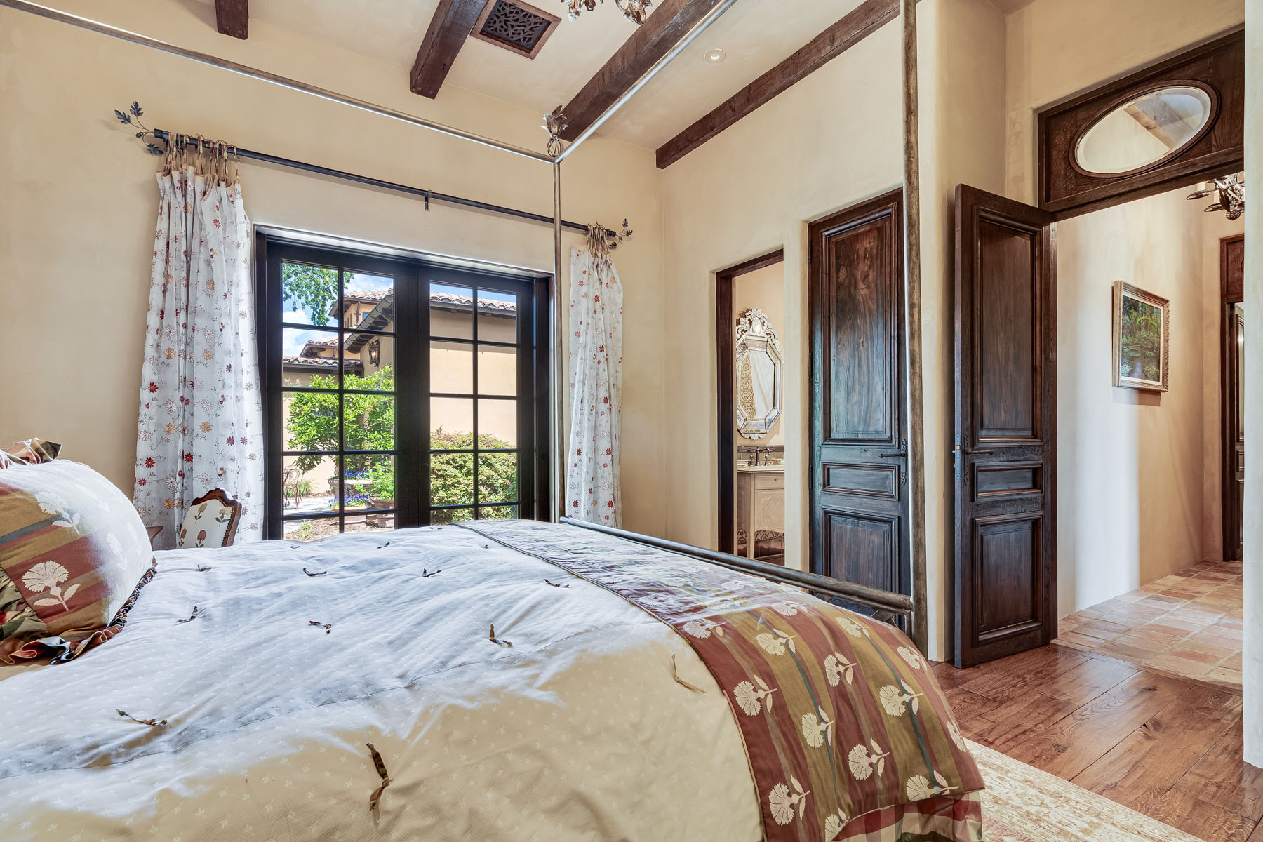 Two bedroom suites off a private hallway with towering ceiling and clerestory windows and oval transoms above each entrance door; each bedroom includes a beamed ceiling and chandelier, French doors to a patio, and stunning uniquely appointed en suite bath (one with tub and overhead shower and one with fossilized limestone shower)