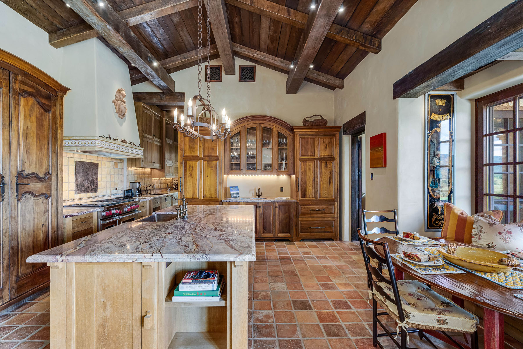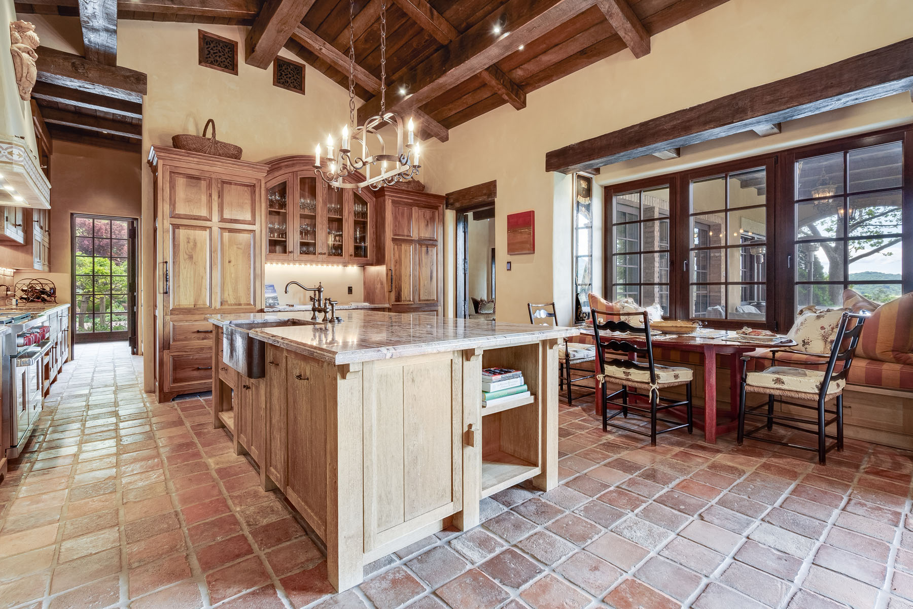 Country French kitchen has solid wood custom cabinetry, antique doors concealing dish storage, granite slab counters, ceramic tile backsplashes with inlaid marquetry, and a copper apron sink; island with counter seating plus separate breakfastalcove with built-in banquette; separate butler’s area with dual-compartment copper sink and significant cabinetry